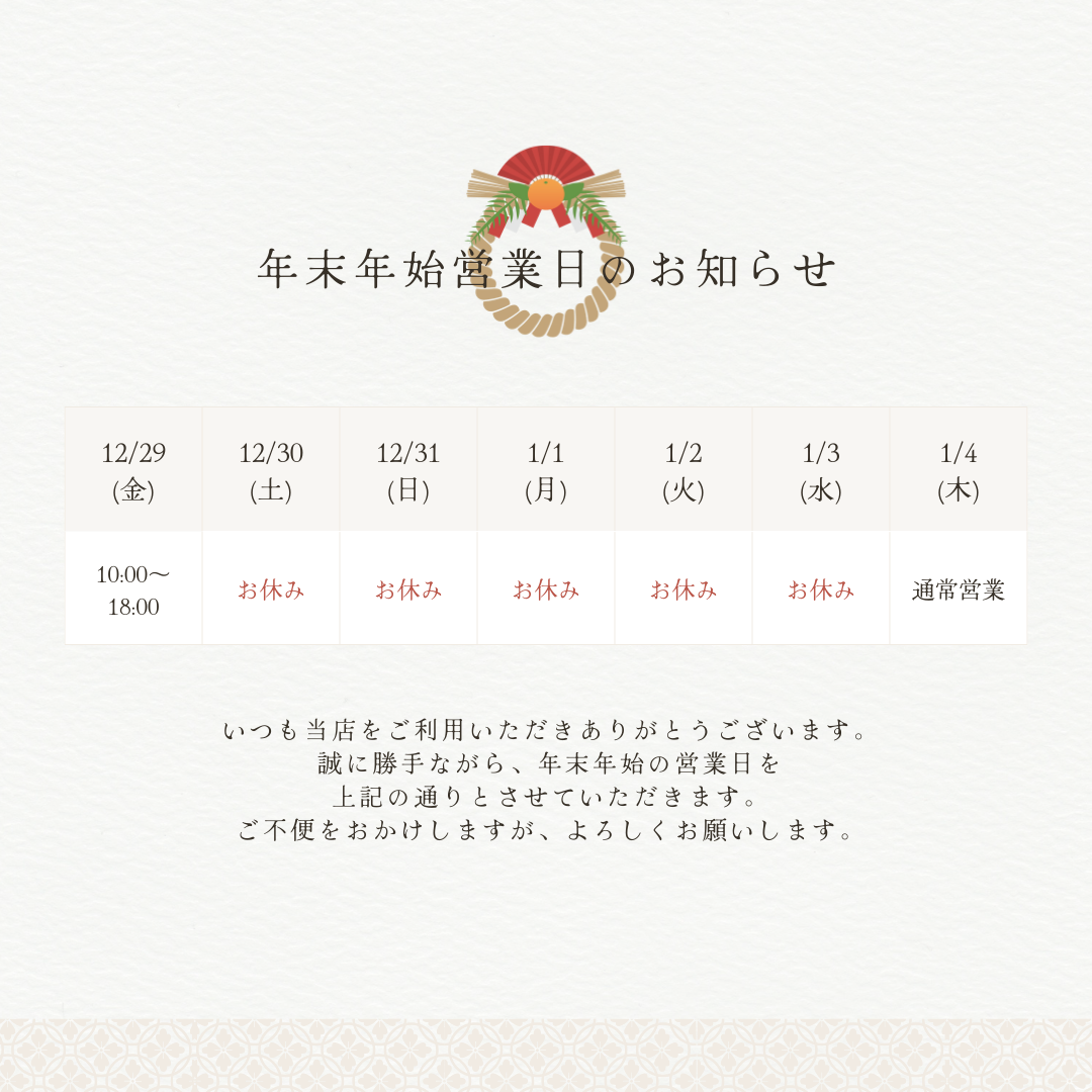 年末年始のお知らせです。 2023/11/272023/11/27 ~年末年始のお知らせ~ 12月29日18時迄の営業となり、12月30日から1月3日まで休業させて頂きます。 尚、新年は1月4日より営業開始となります。