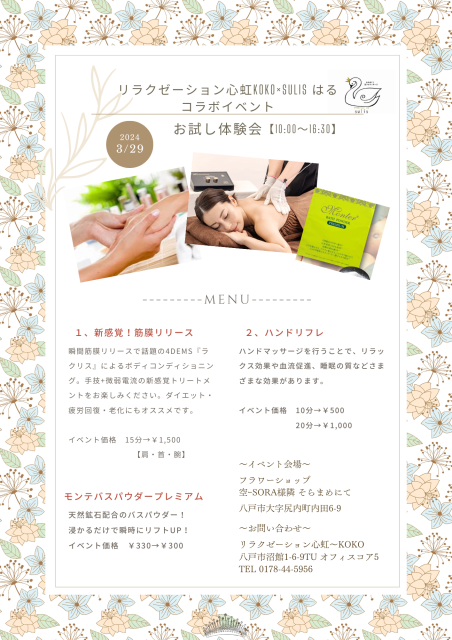 フラワーショップ空‐soraさんにて、筋膜リリース&ハンドリフレのお試し体験会を開催いたします(*^-^*)